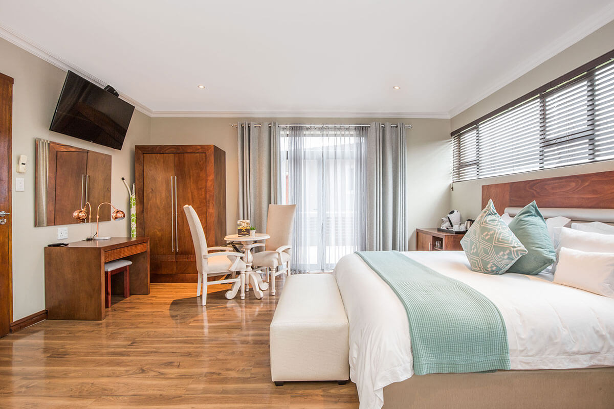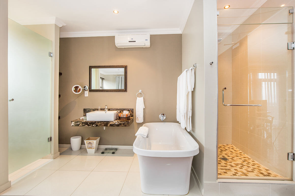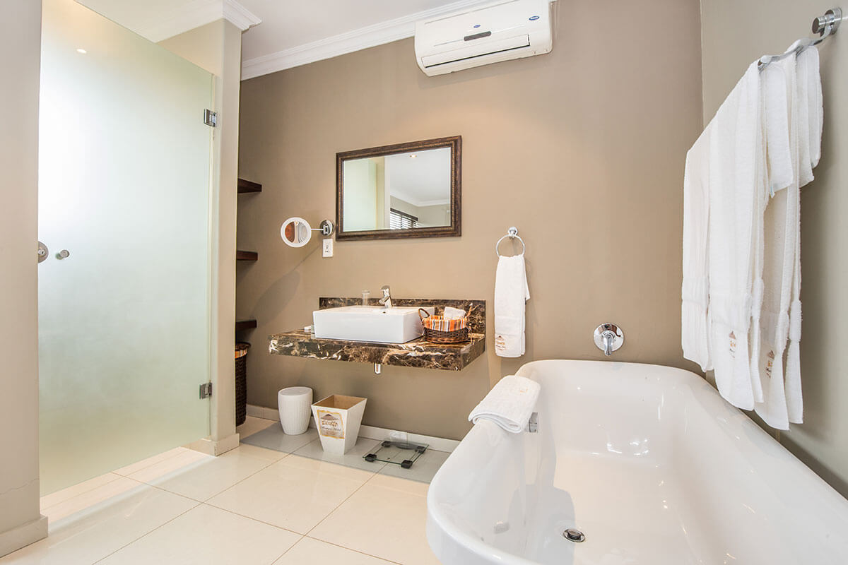 This room has a queen-size bed, and has an en-suite bathroom with bath and shower.